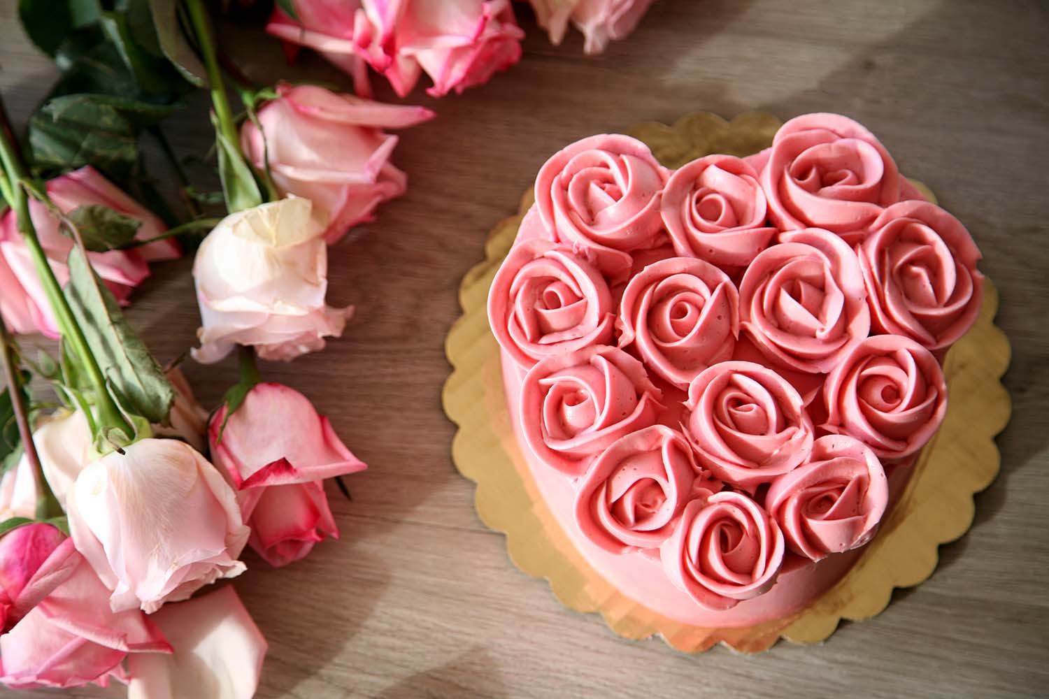 - A dozen pink buttercream roses covering the entire top. Made with plant based natural color.