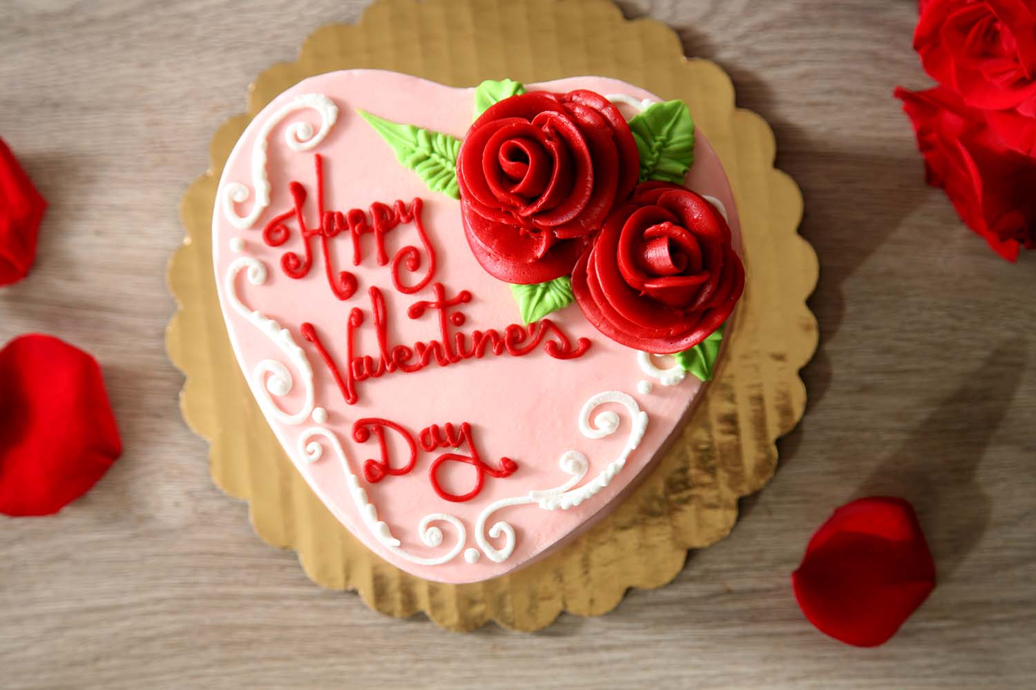 2 heart shaped layers of French vanilla cake with filling of passion fruit mousse, iced with white chocolate buttercream with natural pink color, and special decoration in white buttercream. Delicious, luscious and lovely. 7" x 3"