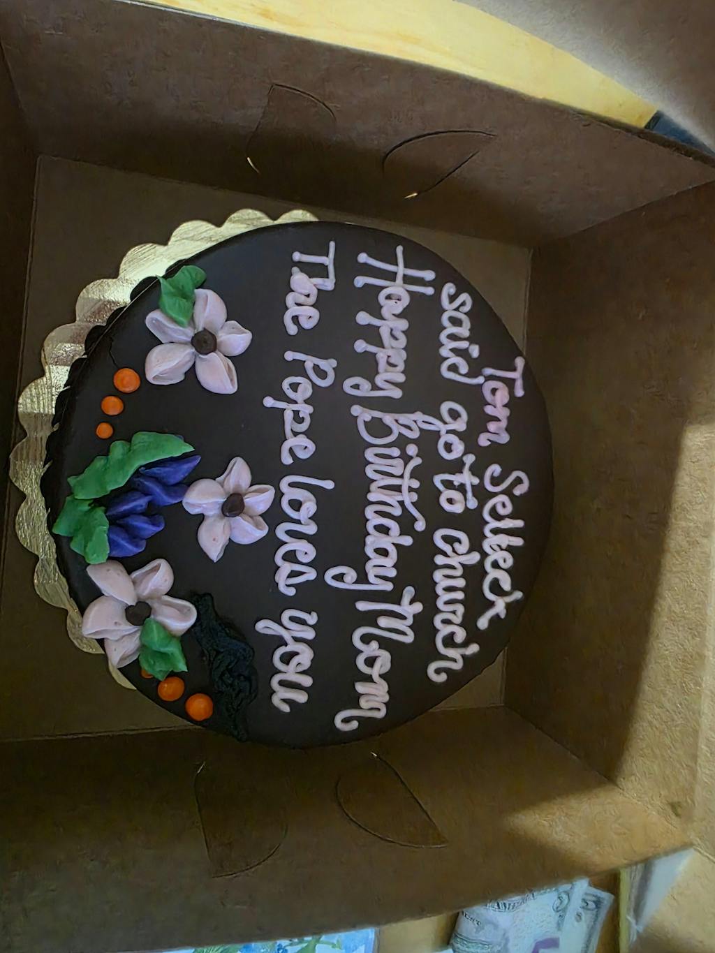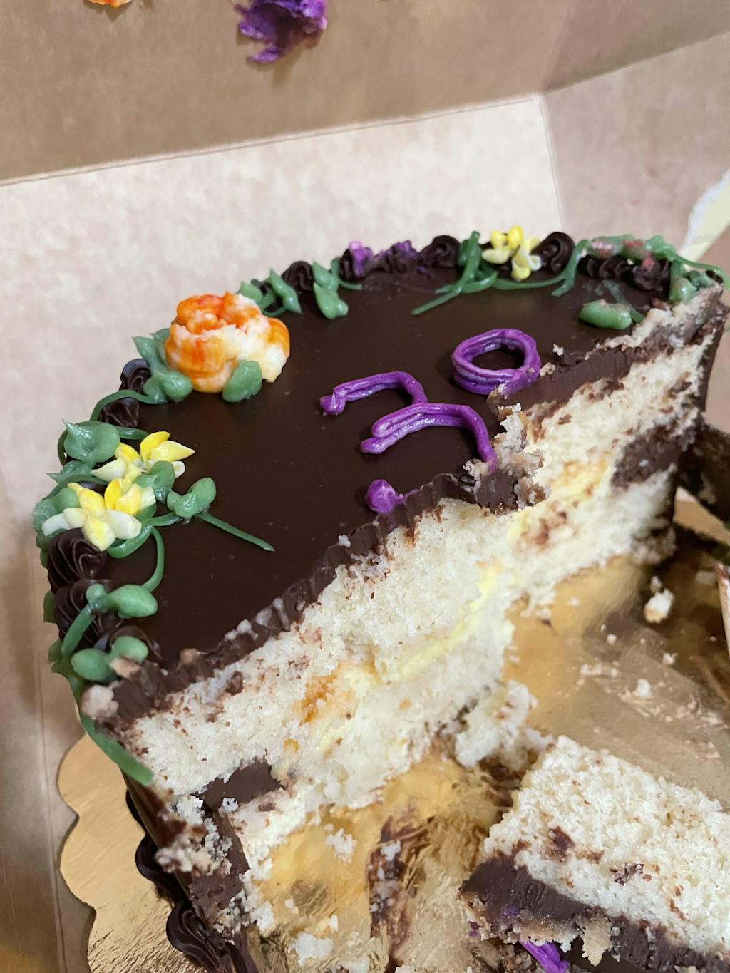 A layer of fresh pastry cream between layers of French vanilla cake, finished with a poured coat of dark Belgian chocolate ganache. Order for store pickup at our Santa Fe location or local delivery. This item is not suitable for long distance shipping. Please provide 24 Hours notice, 48 hours for gluten free.